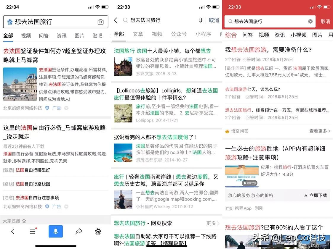 第三个:想去法国旅行,在百度中仍然出现了第一个广告,而在头条中会出现需要准备哪些东西,进行了回答;而微信同样是进行了推荐推广,并没有实质性的回答问题。