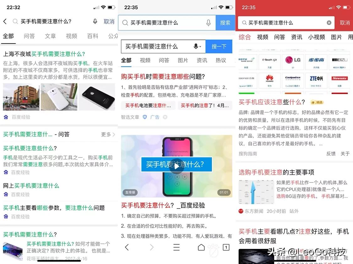 我们看看第一个:三款App给出了不同的答案,这里面微信给出了百度经验,总体来说还是提供了买手机需要注意什么的,一些步骤,而在百度搜索中第一个却是广告;头条搜索,买手机注意些什么,它是一个问题性,解释也相对比较清楚。