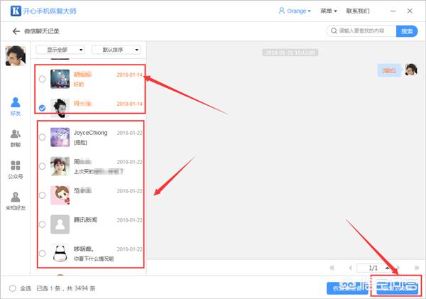 進入微信聊天记錄的恢復界麵後,橙色字體是已经删除的微信聊天记錄,黑色字體是未删除的微信聊天记錄,勾選需要恢復的微信聊天记錄,點擊【恢復到電腦】即可恢復到電腦上導齣查看瞭~