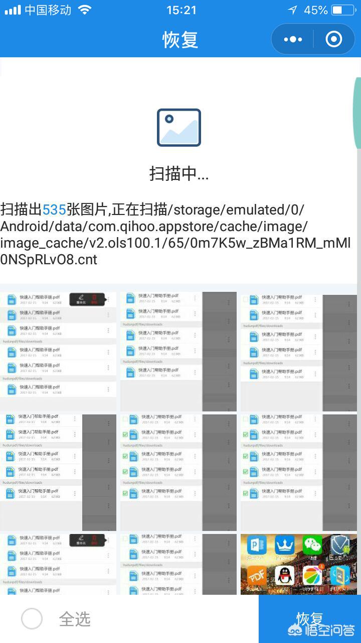 第三步:选择了需要的恢复模式后,界面上会出现正在扫描,这时小程序将会对手机误删的图片数据进行扫描,大家可以耐心等待一会,不要将小程序切入后台。误删的图片就会出现在可恢复选项里。