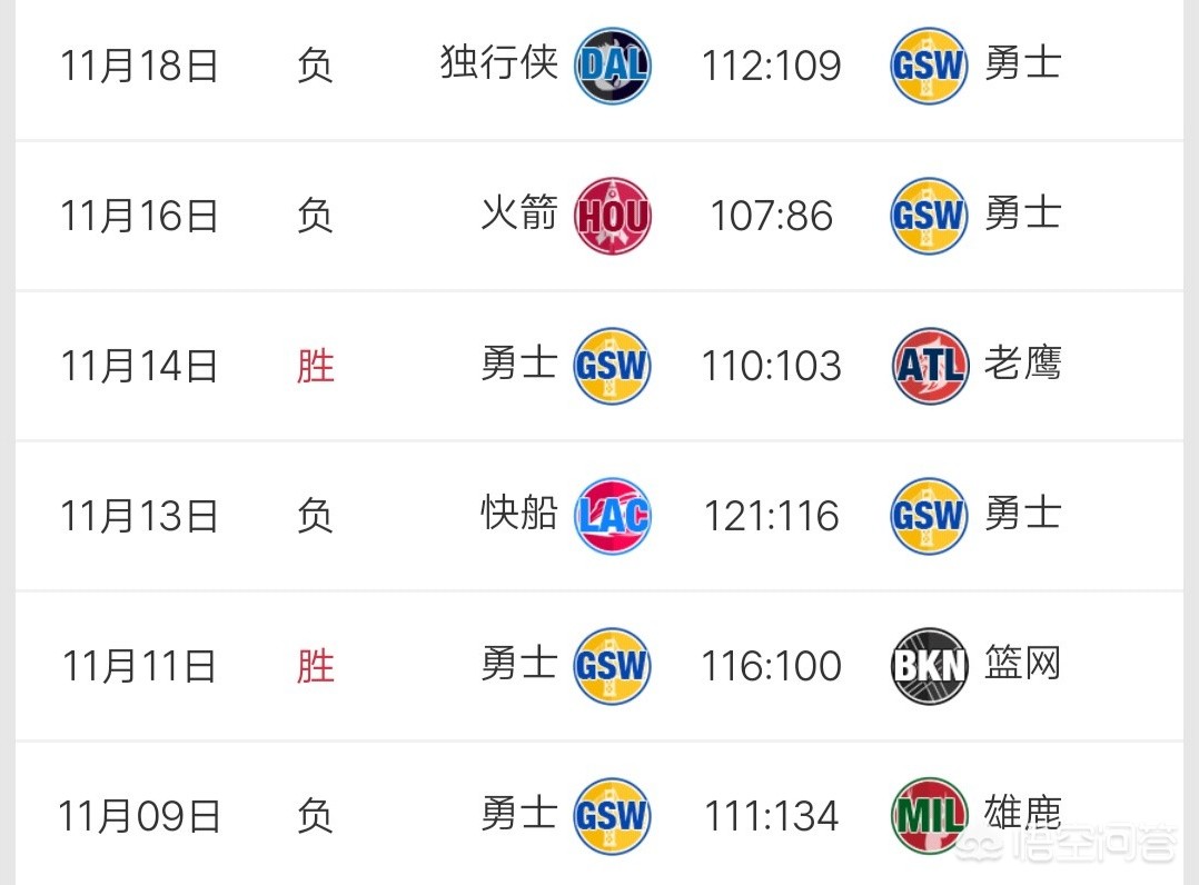 库里自从11月9日在和雄鹿的比赛中拉伤腹股沟肌肉之后,勇士接下来的战绩可以说是“跌入低谷”,仅仅赢了篮网和老鹰这样的东部鱼腩......雪上加霜的是11月18日面对弱旅独行侠同样没能及时止血,以109-112惜败,尴尬两连败的同时,原本在西部稳如泰山的榜首位置也开始变得岌岌可危!从以下球队排名也可看得出来,勇士和第四的快船仅有1个胜场,稍有不慎就会失去西部第一的排位,而且,西部第八的火箭和湖人也只落后3个胜场,差距并不是遥不可及!