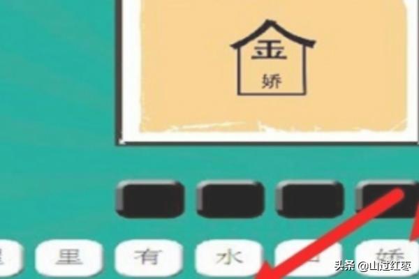 7、在下一题中,我们可以看到在房子的上方有一个金字,里面有一个娇字,我们可以理解为金屋藏娇。我们在用鼠标的左键依次点击金、屋、藏、娇后,这一题就结束了。