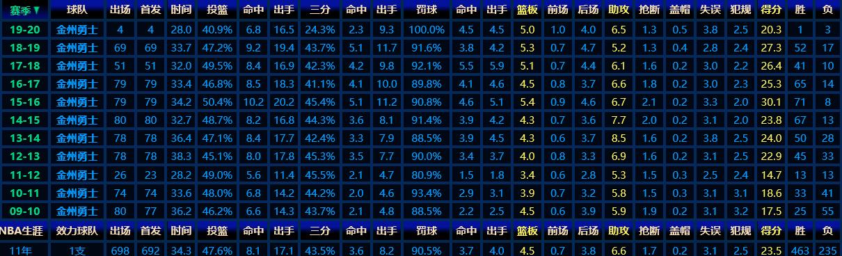 上图是库里的数据表现,库里的三分球命中率保持在41.5%左右,出手次数在10-11次,无论数量还是质量都是联盟最优秀的存在。