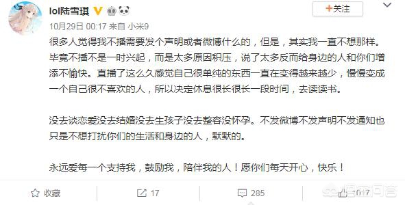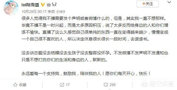 其次在10月29日的时候,陆雪琪突然发表了自己的动态,解释了不播的理由。她表示自己停播不是一时兴起造成的,而是长期的压力实在是太大了。至于网友们猜测的那些停播理由,都是不存在的。比如谈恋爱、结婚、生孩子等。陆雪琪只是决定休息一段很长的时间而已,读读书也可以起到缓解自身压力的作用。