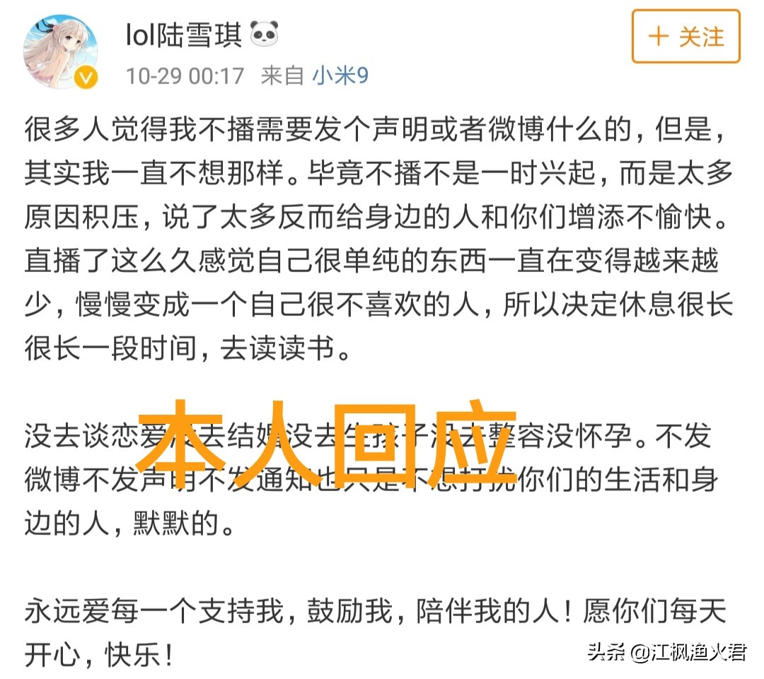 消失了这么久,在近期,陆雪琪终于发布了一条微博动态,详细的给大家解释了停播的原因,大概意思:现在不播是早考虑好的,有太多的原因积压,给自己和身边人带来了不愉快,自己单纯的东西越来越少,变成了那个自己都不喜欢的人。所以,没结婚、怀孕什么的,只是打算去读书。