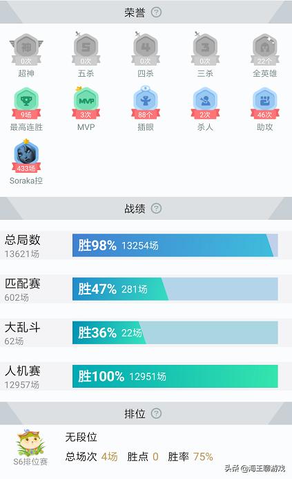 这个女玩家的账号是从英雄联盟s3赛季就开始玩了,到了如今的s9赛季也已经快7年了,不过这个女玩家很特殊,她只喜欢打人机模式,可以从图片看出人机模式总局说高达12,957场,而他的游戏总局数才13,621场,多大部分场所都是用于人机对战!而且打人机它只用奶妈这一个英雄。真的不得不佩服这个女玩家是怎么坚持下来做到的,相信玩过英雄联盟的玩家都能深刻体会到13,000场是什么意义…