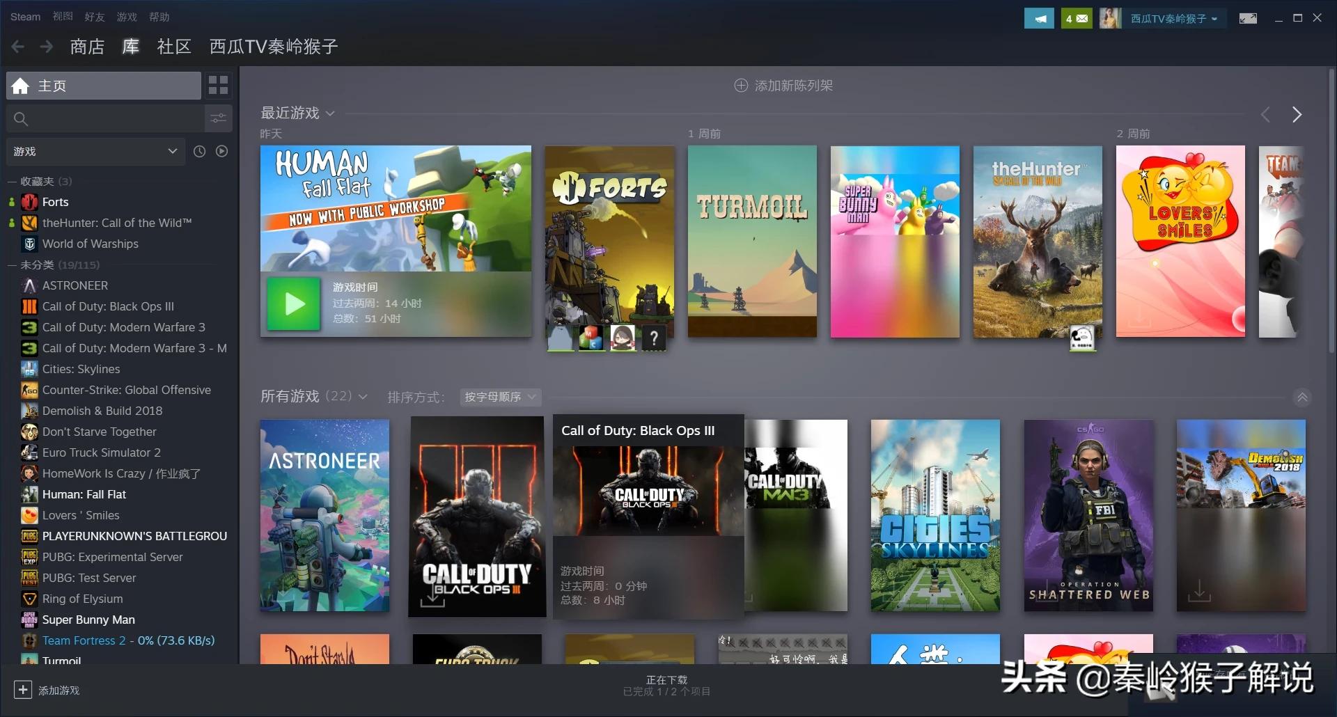 (5)steam平台开始下载游戏,在“库”中查看到正在下载的游戏