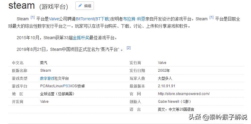 Steam(蒸汽平台)是由美国电子游戏商Valve于2003年9月12日推出的数字发行平台,被认为是计算机游戏界最大的数码发行平台之一。