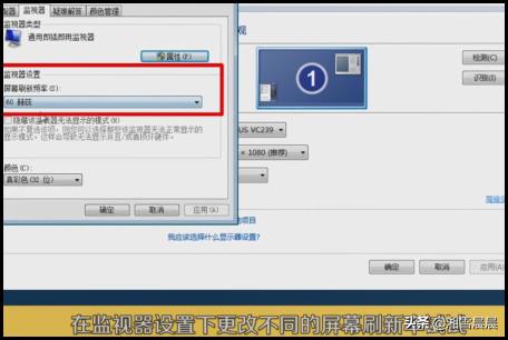 3、在高级设置中找到“监视器”选项卡,在监视器设置下更改不同的屏幕刷新率试试。