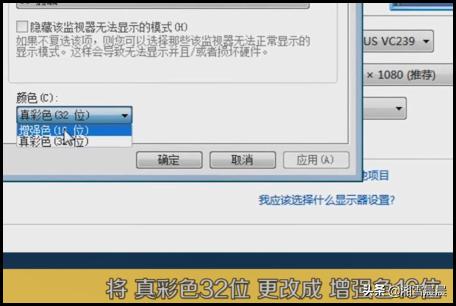 4、之后点击下方的颜色,将“真彩色32位”改成“增强色16位”,点击“确定”即可。