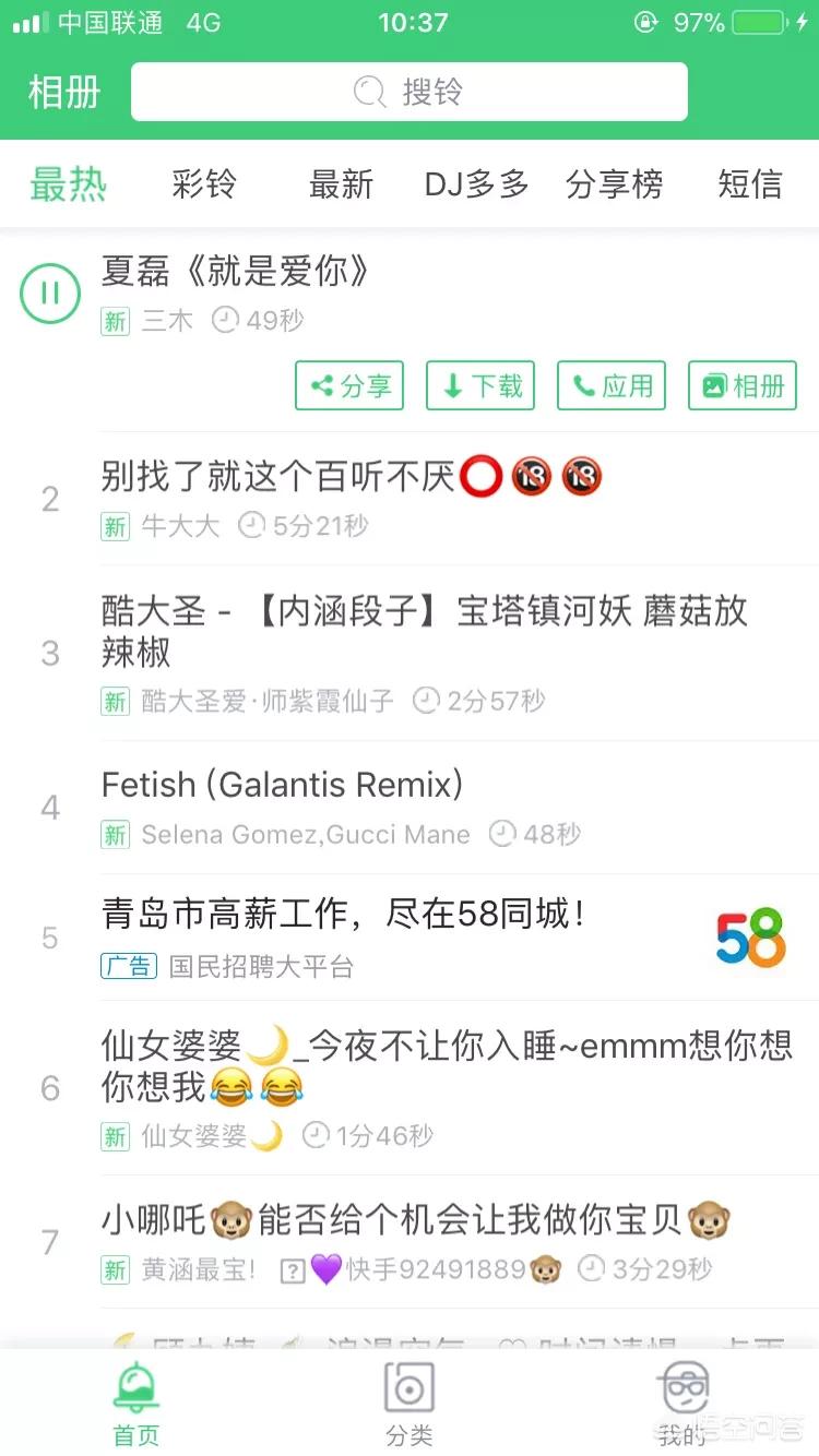 要说手机铃声软件我真的没有用过,我手机上的铃声不是靠手机铃声软件下载的,而是用酷狗音乐剪切的,每当听到一入耳的歌,都会上酷狗上把它给挖出来,有的不知道怎么唱的,就直接自己哼出来让酷狗识别,然后剪切,设置成手机铃声