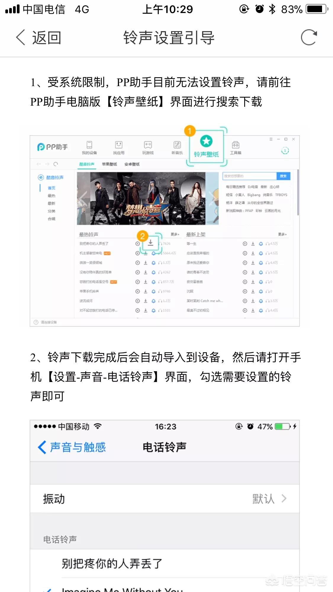 免费铃声对于安卓系统来说是特别简单的,基本自带的手机应用商城都会自带,只需要下载选择就好,但对于苹果IOS系统来说,更换一个自己的铃声却特别难,主要来自本身系统的限制。但是我们也有办法,就是麻烦点,大家用电脑下载PP助手(推荐)然后选择铃声,下载就好,然后到苹果设置,找到铃声,选择你要的铃声即可。下方是操作图