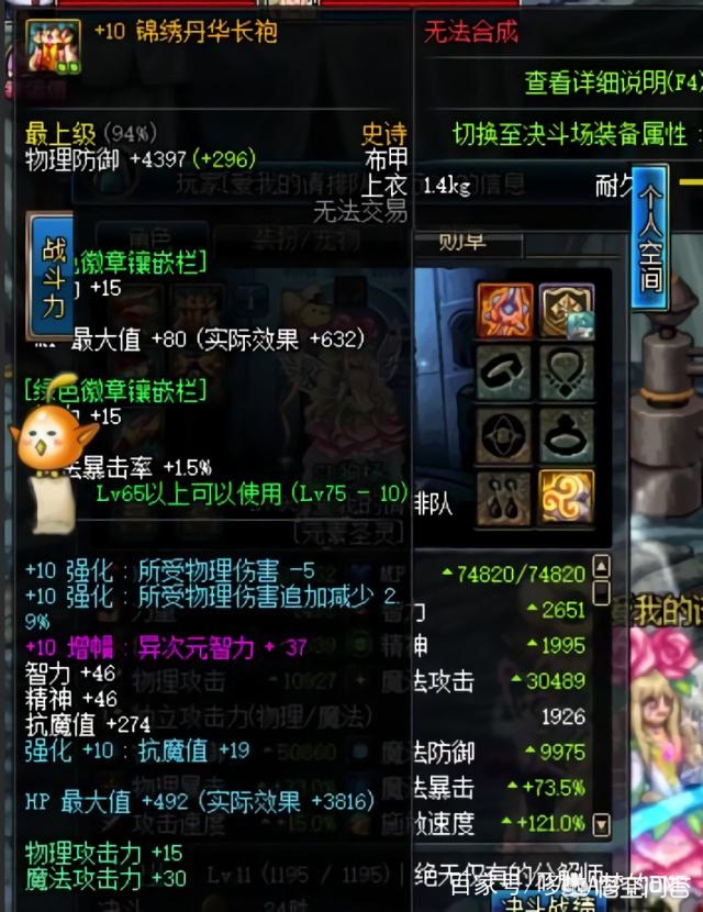 最近有位DNF90版本的大佬回归,装备打造看呆众人,那么他这套装备有何奇特之处呢?从截图中我们可以看到角色的防具是锦绣丹华套,这是一套75级史诗套装,套装属性也非常强悍,攻击时有3%的机率使敌人减防20%,每3000点魔防可增加自身2%的独立和魔攻。关键是这套装备打造非常完美,五件防具全部都增幅到了10,打得也都是80版本的极品徽章,红25智力和绿15智力都有。最重要的是附魔宝珠,很多萌新玩家没见过。