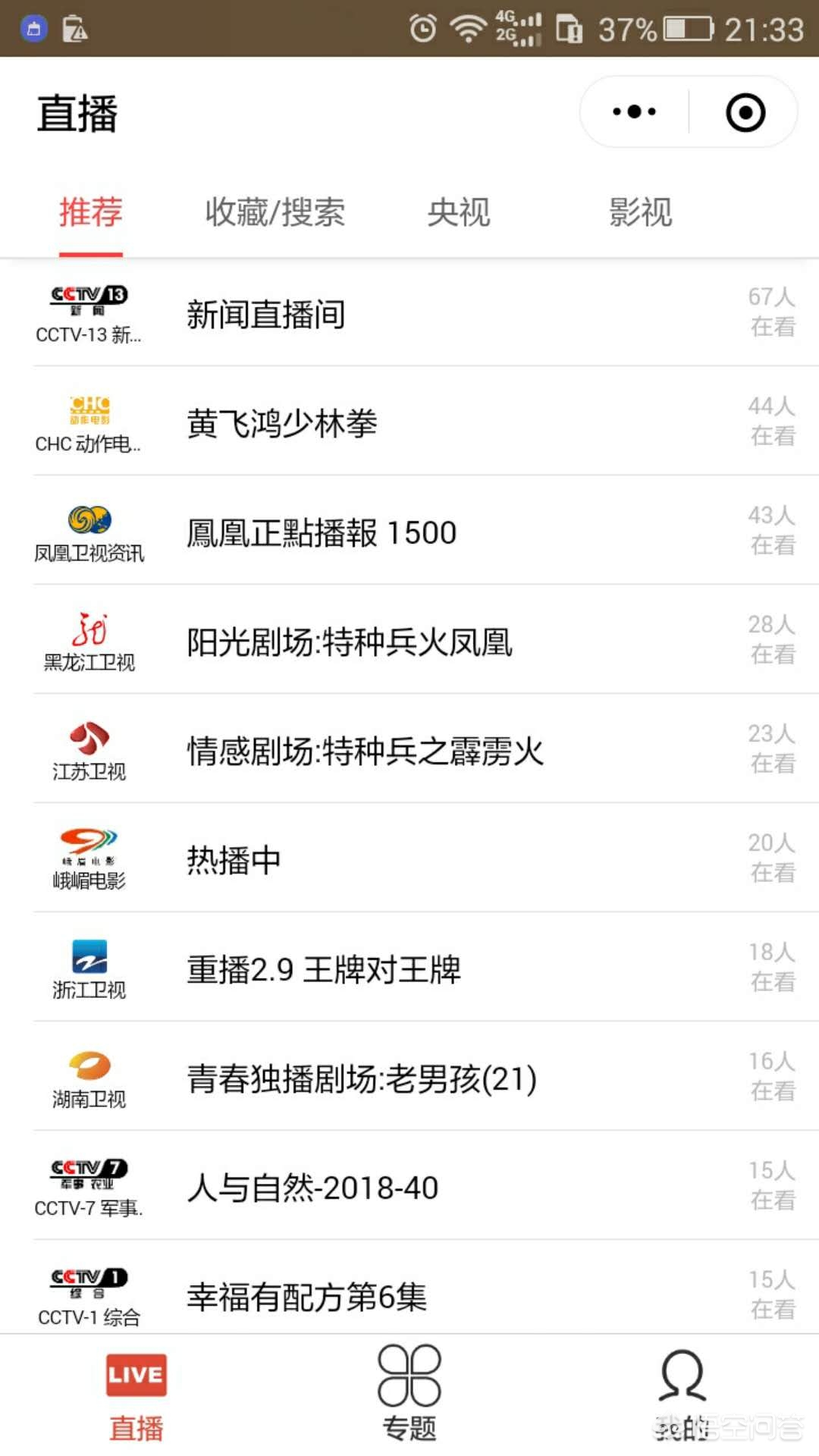 这个是打开小程序里面的界面,有各央视、卫视、娱乐及电影频道
