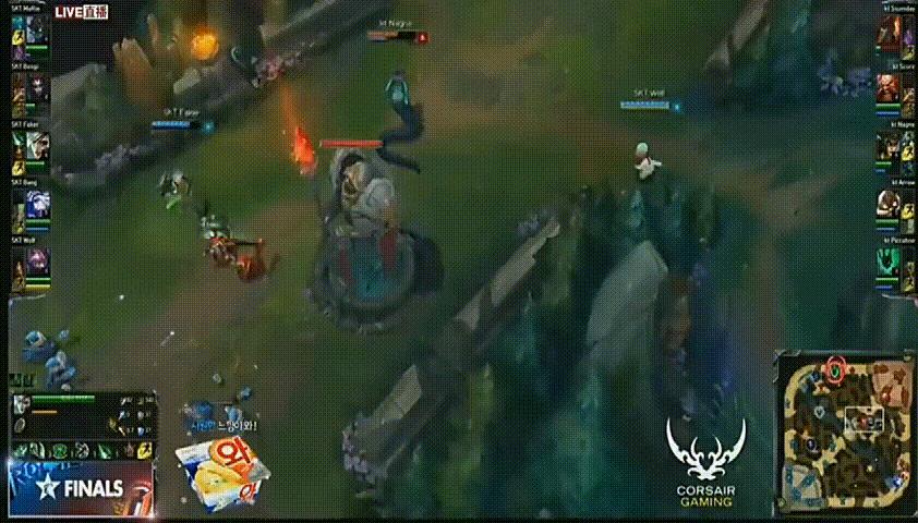 Faker在比赛的前期就拿到了巨大优势,在拿下了两个人头之后直接叫来了辅助准备越塔强杀蛇女,他的瑞雯先是一个两段Q技能位移接近蛇女,蛇女眼看辅助然后越塔直接闪现到二塔,Faker直接跟闪现,一个预判蛇女大招的走位,没错,看着动图你就会知道Faker当时做了什么,一个小小的扭头躲掉了蛇女的大招石化,而辅助WOFL并没有躲掉,要知道Faker是在往前冲的情况下突然扭头的,最后一个第三段Q技能击杀了KT的蛇女,这种操作让当时的解说德云色和贝拉一阵惊叹,恐怖如斯!