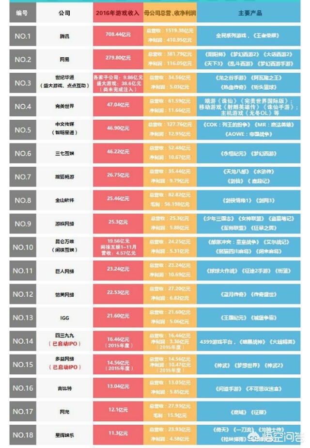 下面就是2016年国内游戏公司收入排行榜: