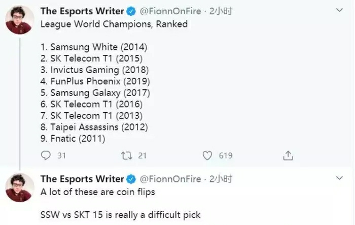 目前英雄联盟的比赛已经来到了s10赛季,在此之前已经产生了九个世界总决赛的冠军,就在最近ESPN的记者也是给这些冠军战队的实力进行了一个排名,第一名给到了2014年的三星白战队,第二名是2015年的skt战队,第三名是2018年的ig战队,第四名是2019年的fpx战队,最后一名是2011年的fnc战队,这个排名一公布,瞬间就引发了大量玩家的热议,让很多的玩家非常意外。Skt战队和lpl赛区的队伍均没有拿下第一名!