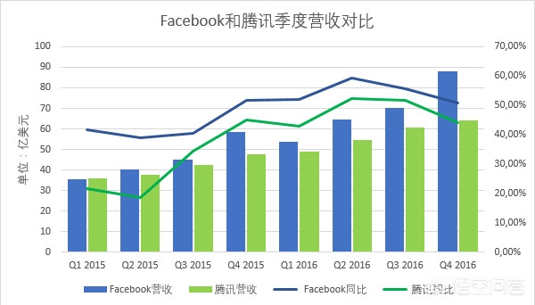 从营收绝对值上对比,1998年成立,2004年上市的腾讯,在2015年之前营收基本是超过成立于2004年的后起之秀Facebook。但是从2015年开始,Facebook的营收就逐渐跟腾讯拉开差距,Facebook的营收大约是腾讯的1.4倍。
