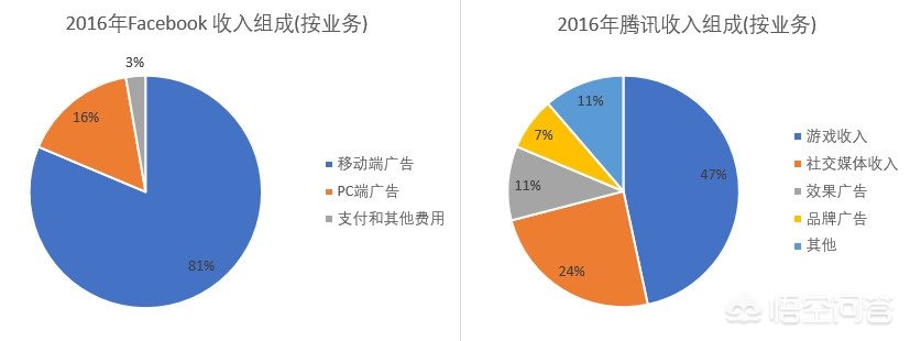 从收入组成上来看,Facebook主要靠的是精准广告,而腾讯主要还是依赖于社交及移动端的游戏等应用。