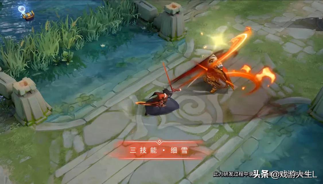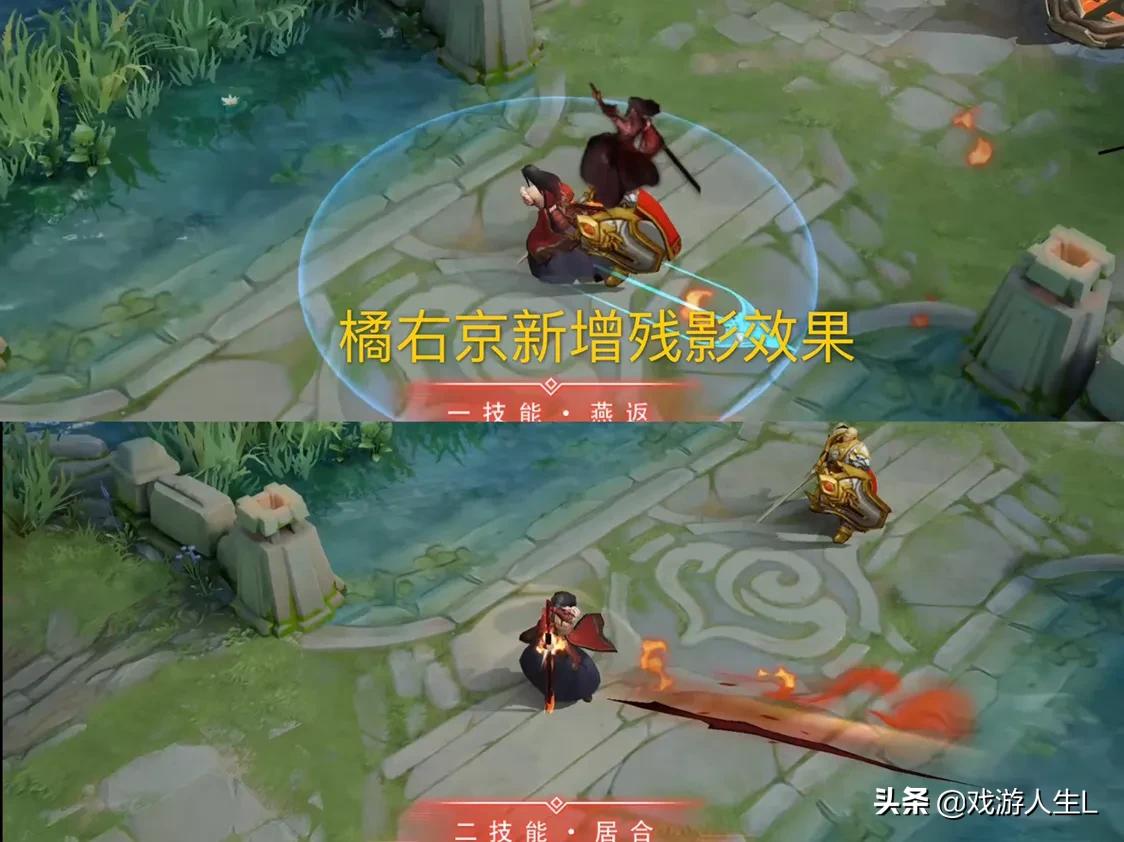 一技能燕返:橘右京出刀过程中,刀光附带了火光效果,橘右京武士刀挥舞半个火圈,视觉上给人一种火焰飞舞的特效感,同时在橘右京回退过程中,会出先橘右京在位移过程中残影,应该是橘右京的行动轨迹,技能特效十分具有饱和感。