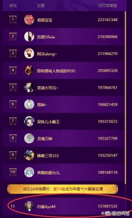 近日斗鱼年度活动火热进行中,为冲前十巅峰而引发关注的主播就有一条小团团,呆妹儿,白鲨,旭旭宝宝等知名主播。各大主播为冲榜单也是下了血本,但令人遗憾的是,一条小团团并没上榜,至于呆妹儿,则是幸运的冲上了第七名,收获也是十分不错。