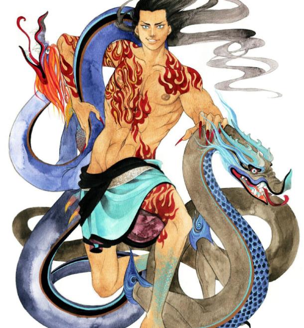 4、祝融:兽头人身,双耳穿两条火蛇,脚踏两条火龙,全身火红鳞片,南方火之祖巫。