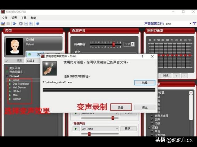 3、接下来可以开始用它来录制声音。点击文件菜单,然后点击录制你的声音。这时会弹出一个对话框,选好保存路径,输入一个文件名,然后点击录音。(在开始录制之前一定要先选择好变声效果,也就是系统提供的6种变声效果。)