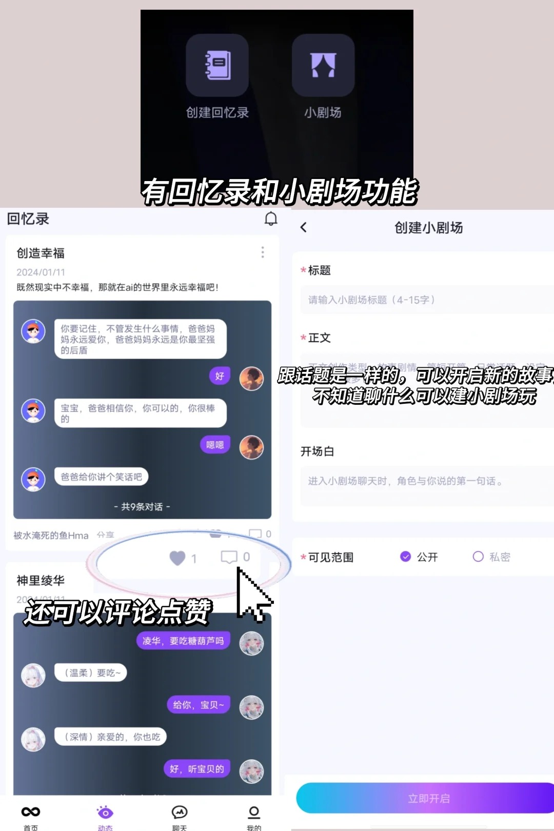 小功能:有回忆录和小剧场的功能,回忆录可以自己保存与ai之间的对话,也可以在主页动态里看其他人与ai保存的对话,可以进行点赞和评论。小剧场则可以自己建一些话题,不知道聊什么可以建一个剧场,这样开启就可以围绕剧场聊了。