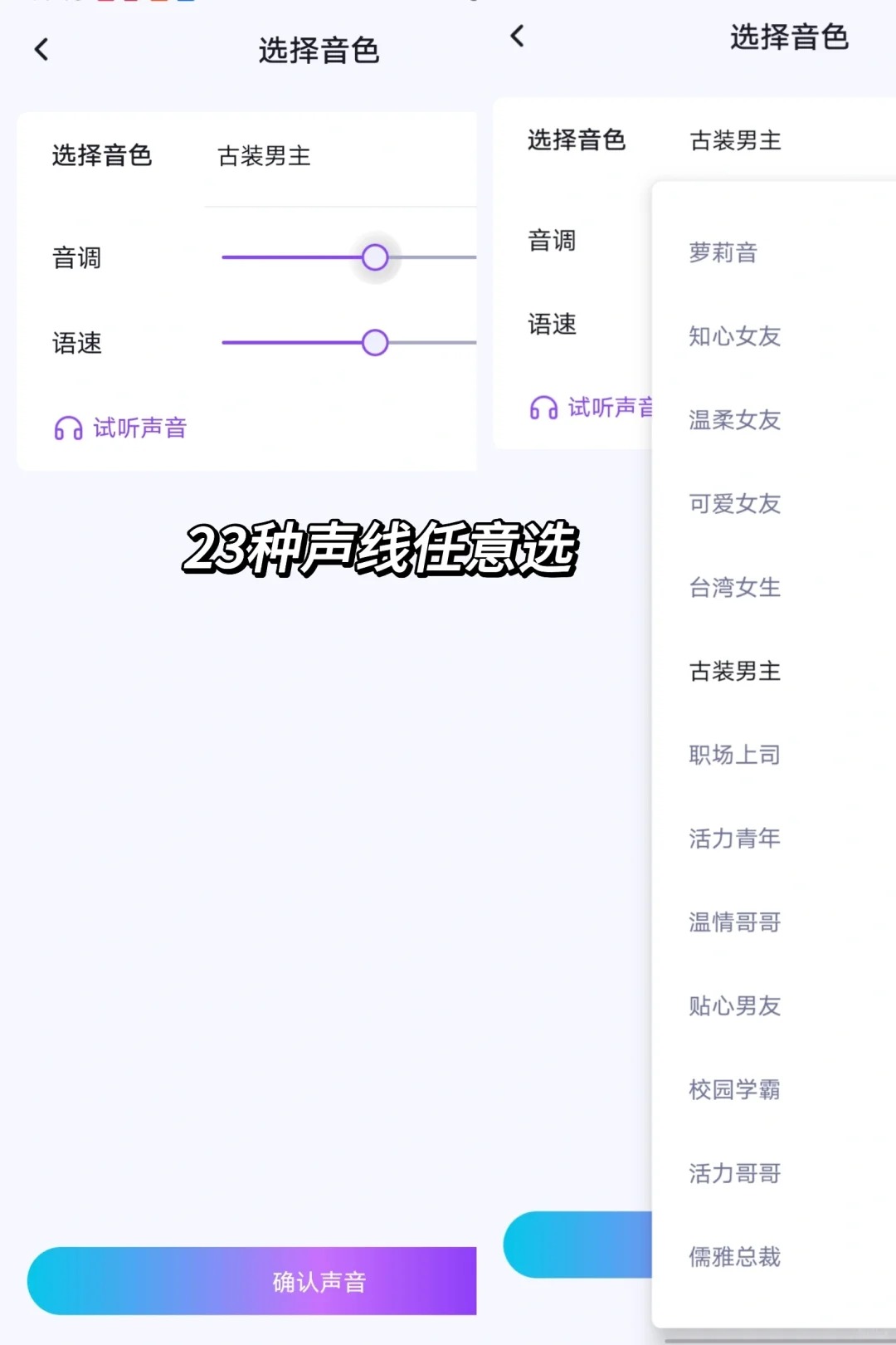 声线:共有23种声线,比较丰富,可以自己选择想要的声线,目前不能叠加只能选一种~除了克隆声线需要氪金其他的都是免费的。