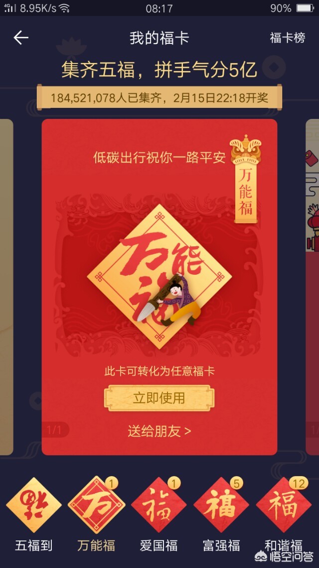 想快速扫到敬业福是不好办了,现在是大年三十,已经接近尾声,提前在这里给大家拜个早年。我前几天就已经凑齐了支付宝五福,今天运气很好,又拿到了一个万能福。我会随机送大家,大家可以在评论区留言,我会随机抽取比较好的一个留言,万能福送给他,今天大年三十,说到做到,过了这个村没那个店啦!