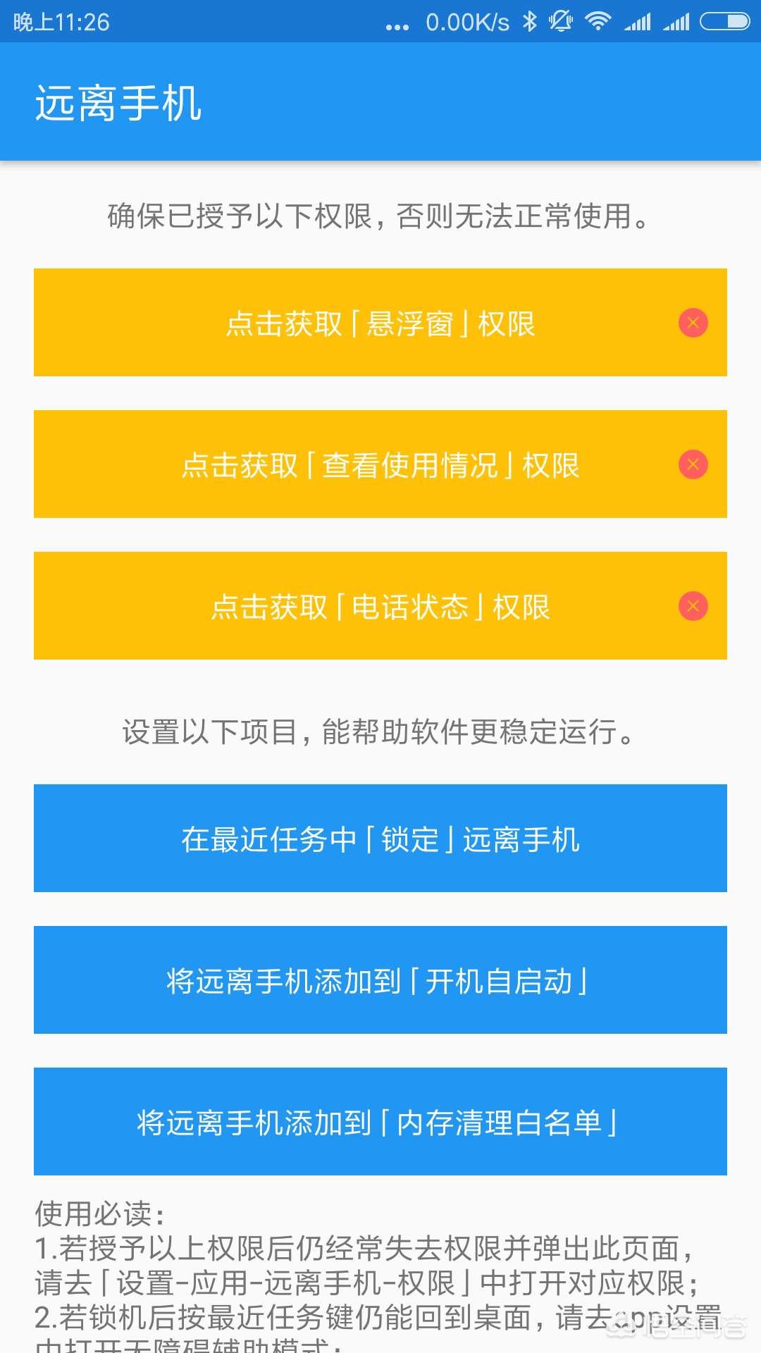 当然开启这个软件还需要进行一些权限设置,,我们点击自定义,分享点击获得相应的权限,软件涉及到悬浮窗、查看使用情况、电话状态等权限,还有你还能设置应用白名单,就是设定了远离手机时可以用