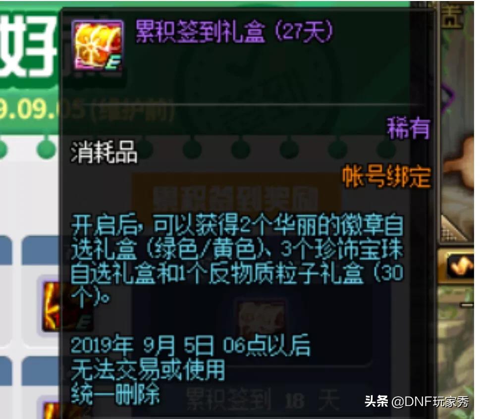 累计27天,获得华丽徽章(绿色/黄色)自选,估计是绝版的15力,3个18属强的首饰附魔自选,30个反物质粒子。