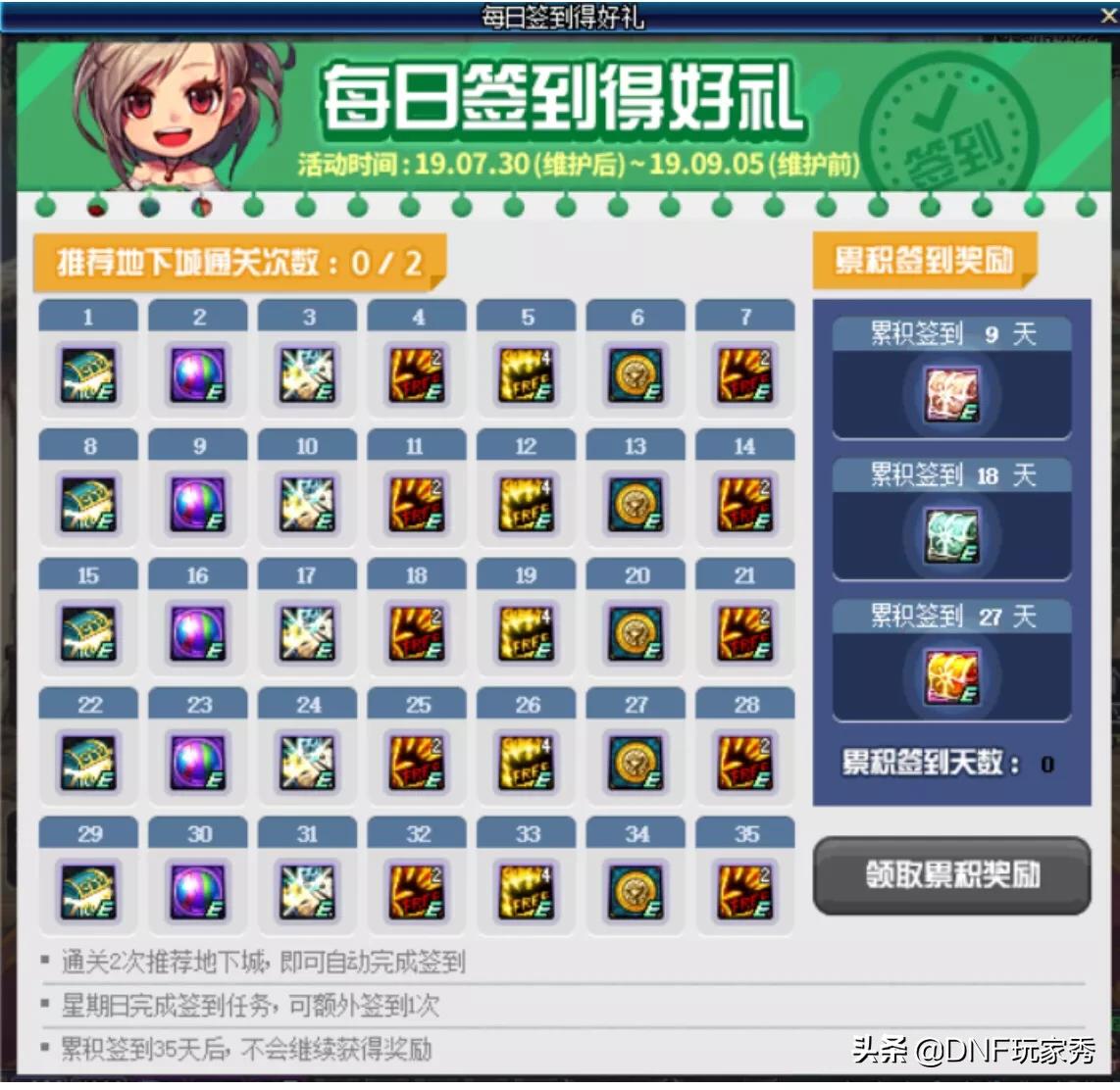 DNF将于7.30版本上线新的每日签到活动,这次活动签到的奖励可谓是空前豪华,居然有机会获取稀有装扮,我们一起来先睹为快!