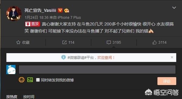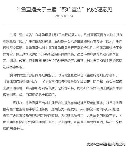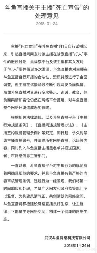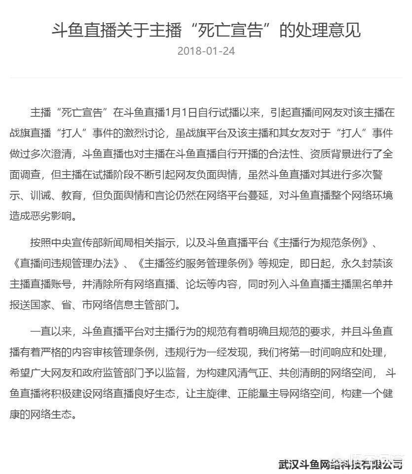 2018年1.24号斗鱼发布通告,公布了对主播“死亡宣告”的处理意见,其中提到“即日起,永久封禁该主播直播账号,并清除所有网络直播、论坛等内容,同时列入斗鱼直播主播黑名单并报送国家、省、市网络信息主管部门。