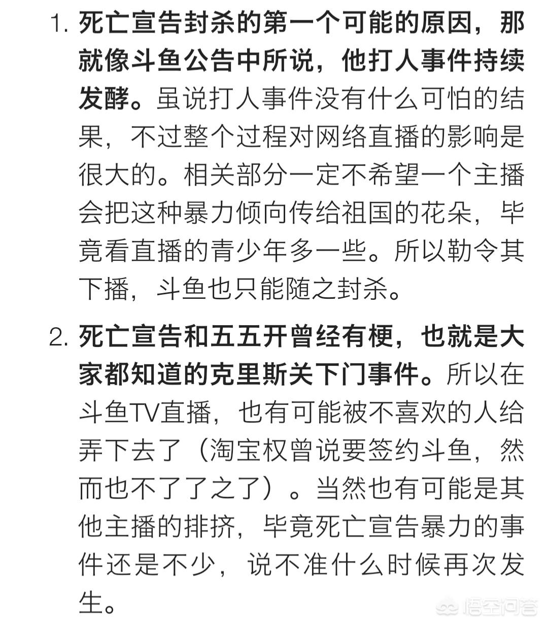 第二次斗鱼官方宣布永久封杀死亡宣告,原因是因为其之前打女友事件持续发酵,致使舆论影响到了斗鱼直播。相关部门也不想传播暴力,所以就永久封杀了。