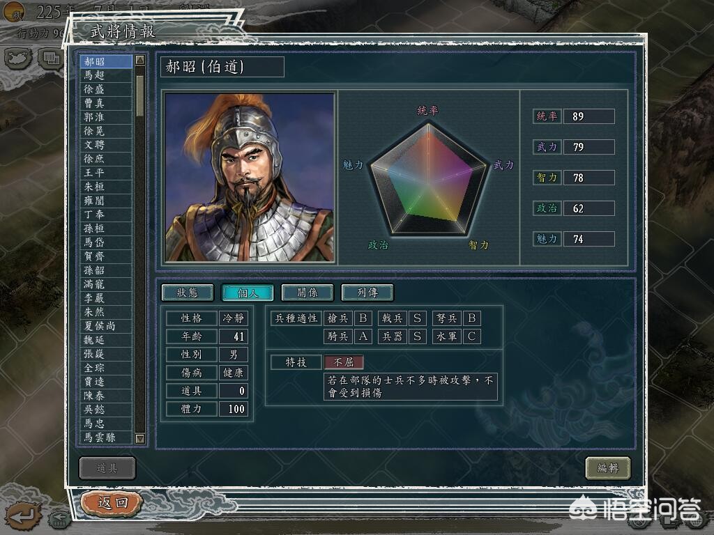 后期剧本里,郝昭绝对是一个令人望而生畏的猛将,尤其是当他带着一万多戟兵来打你的时候,真的会肉到你绝望。没有名将打高额输出,郝昭防御又高,即使你发动战法伤害也不是很足。等你没气了只能普攻时就更绝望了,因为郝昭的特技“不屈”加上戟兵大盾的加成效果,总是会屡屡免疫你的普攻。