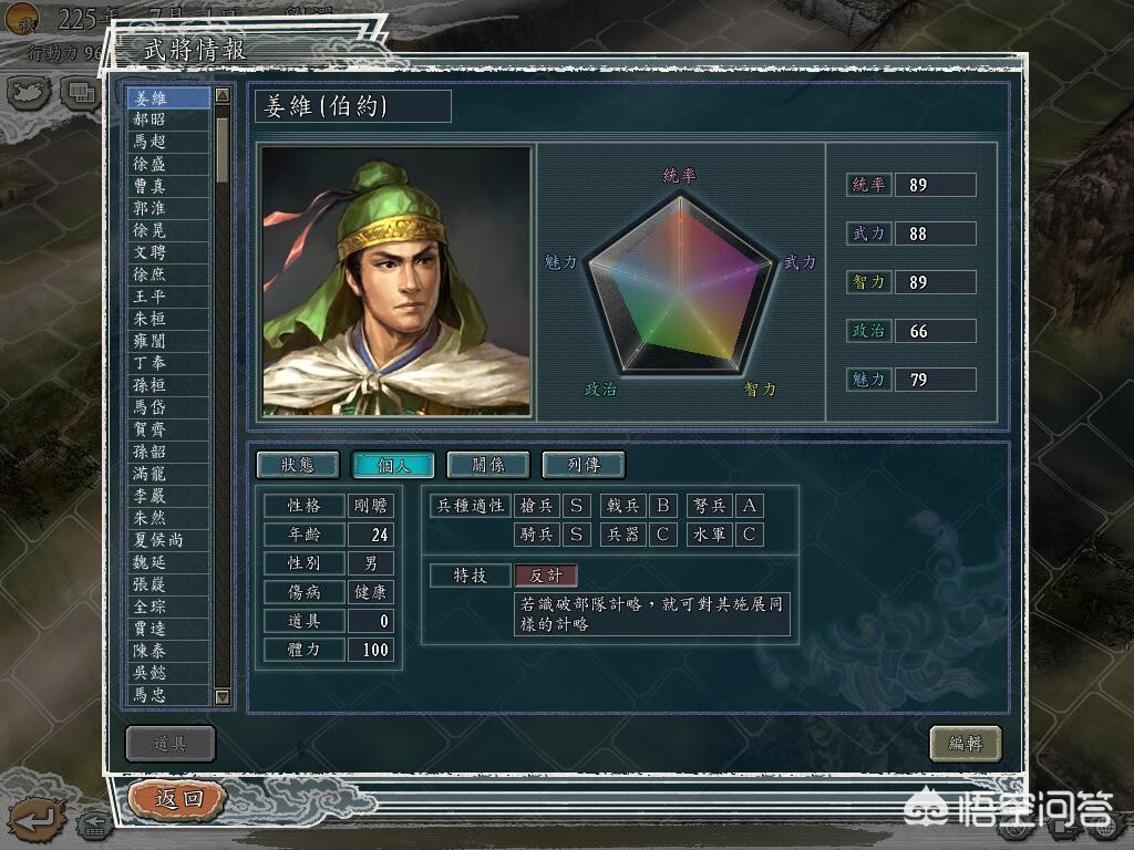 姜维和邓艾算是后期剧本里两个最强武将了,他们统武双高,攻防兼备,带满兵时给人的感觉就像是移动的超级坦克。别人普攻打他们一下没什么伤害,却要承受高额反击伤害。不过邓艾和姜维相比的话,还是邓艾好用一点,毕竟姜维特技“反击”只是一个摆设,而邓艾的“强行”要实用多了。