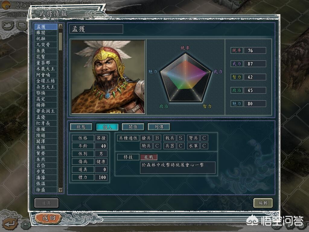在“三国鼎立”剧本里,魏国后方的公孙度弹指可灭,吴国后方没有任何威胁,只有蜀国后方有相对强大的势力孟获。不过玩家都不会觉得孟获是威胁,反而会抓紧吞并孟获势力以得到一大批属性不错的武将,比如祝融、花鬟、兀突骨等。除此以外,南蛮王孟获也是后期很强势的武将,堪称森林中的“猛张飞”。