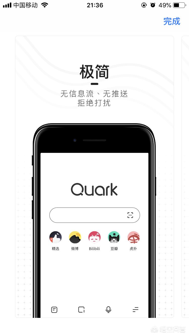 1.夸克浏览器,这款浏览器是UC旗下的一款浏览器,用过UC浏览器的朋友都知道UC浏览器的界面还是比较复杂的,里面铺满了各种卡片、链接、广告等,会让人有一种眼花缭乱的感觉。但是夸克浏览器就不一样了,夸克浏览器主打的就是简洁,打开后,界面非常清新,没有多余的东西,更没有广告,这对于哪些洁癖用户来说简直是一大福利呀!