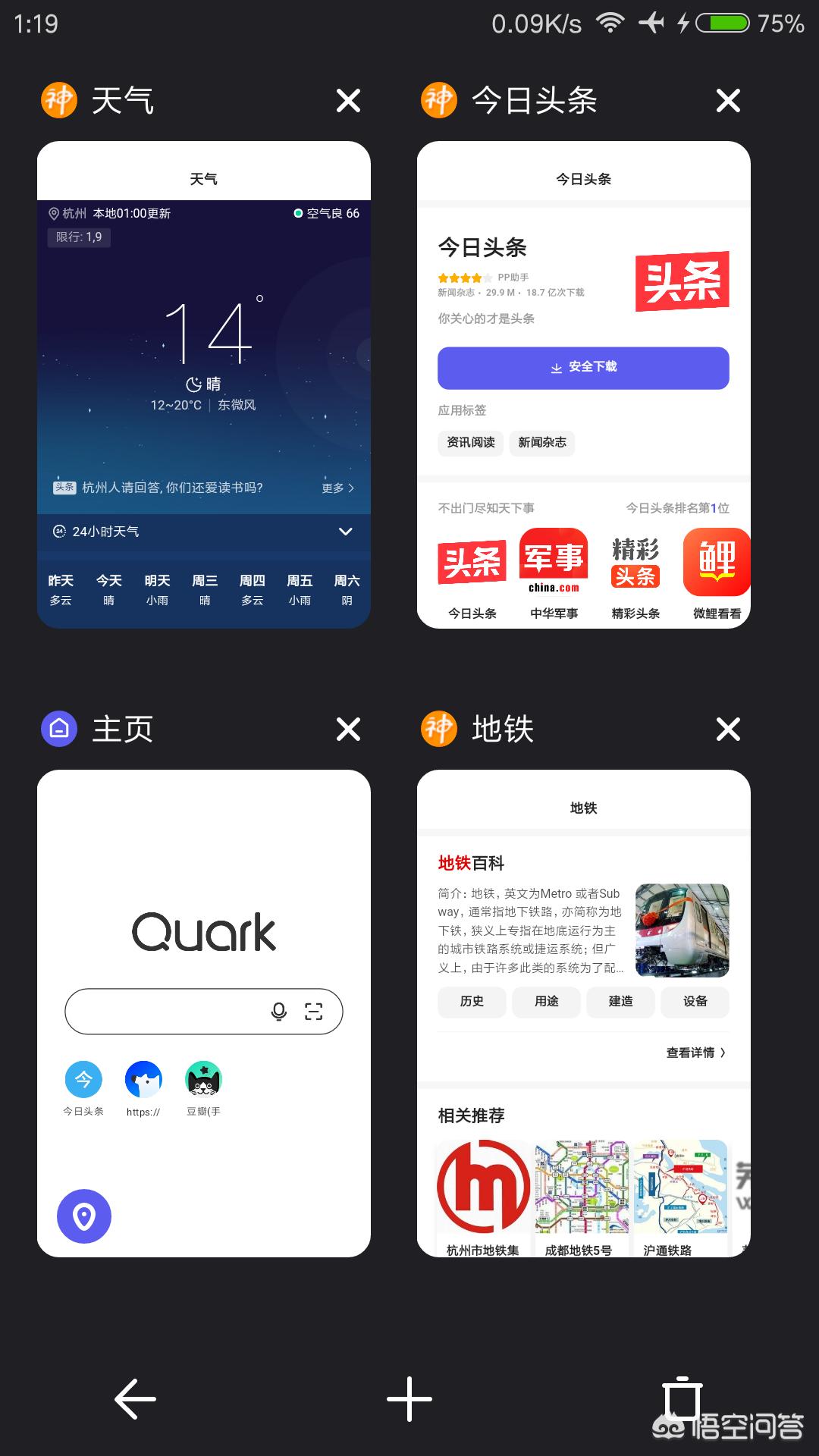 4、主界面风格类似于chrome,自上而下logo、输入框、标签、工具栏排序。搜索浏览信息时,夸克不同于其他浏览器输入框没有做到顶部,而是设计在手机底部,考虑到用户手机屏幕越用越大。