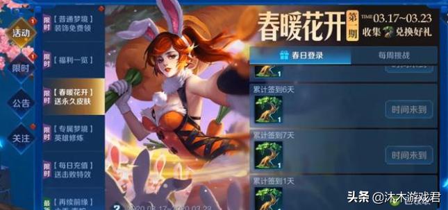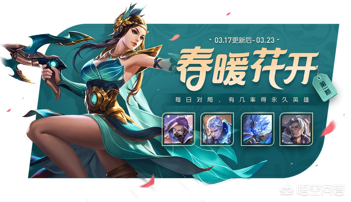 首先是春暖花开活动,参与活动,有机会获得永久英雄/皮肤。时间是更新后至4月13日,活动分为四期,每期持续一周,完成每周的任务收集暖春幸运树来兑换礼物。四期活动最多可以收集68个暖春幸运树!