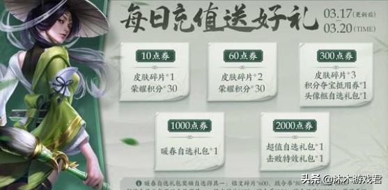 开启了每日充值送好礼活动,玩家每日充值满2000点券额外赠送超值自选礼包*1+击败特效礼包*1+暖春自选礼包*1+头像框自选礼包*1+积分夺宝抵用券*1+皮肤碎片*6+荣耀积分*6。