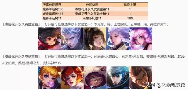 暖春幸运树兑换时间是3月31日-4月14日。玩家可以用不同数量的暖春幸运树兑换永久皮肤宝箱、永久英雄宝箱、荣耀小礼包。其中永久皮肤宝箱和永久英雄宝箱最多只能兑换一个。荣耀小礼包理论上是可以兑换100个,但是相信没有人会傻到去兑换这个吧。按照天美给出的暖春幸运树数量,玩家可以刚好兑换一个永久英雄宝箱和一个永久皮肤宝箱,还有一个荣耀小礼包。