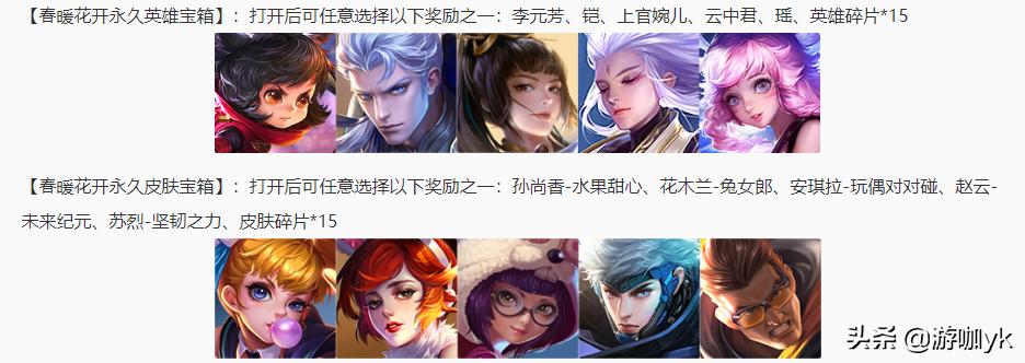永久英雄宝箱打开后可任意选择以下奖励之一:李元芳、铠、上官婉儿、云中君、瑶、英雄碎片*15。