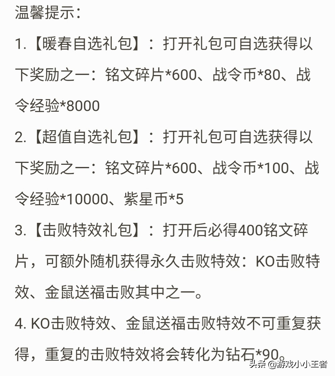 3.17-3.23通过对战掉落春风和煦礼包,胜利可获得两个,失败则获得一个,开启后可以得到包括铭文碎片、永久英雄、钻石、1日体验卡等在内的诸多奖励。