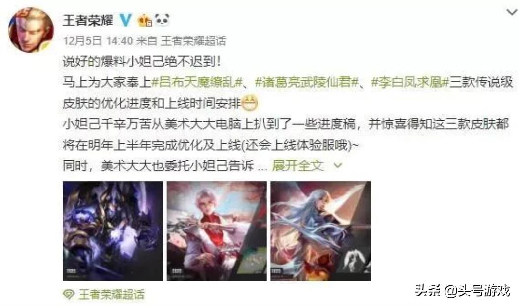 在前段时间,天美公布几款限定皮肤的优化进度,其中除了凤求凰之外,还有吕布的天魔缭乱、孙尚香的末日机甲、小乔的天鹅之梦、诸葛亮的武陵仙君。并且官方表示,凤求凰会在春节期间上线最终优化完成的版本,其余几款具体的上线事件还没公布,只是说会在2020年的Q2,也就是明年的5/6月份这个时间点。