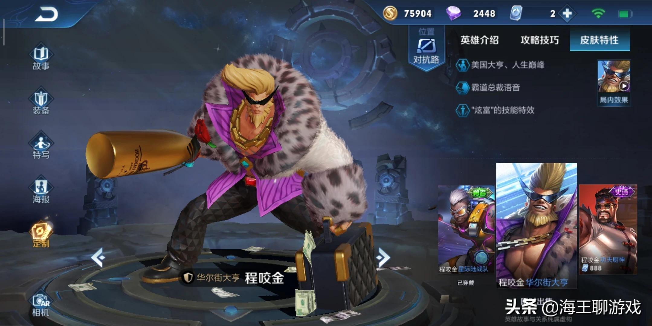 第二款返厂的皮肤是程咬金的“华尔街大亨”,新款皮肤是一款土豪皮肤,程咬金这款皮肤看起来非常的阔气,也是一款限定皮肤。不过本人不建议买,因为这款皮肤没有品质,论特效手感还不如星际陆战队。
