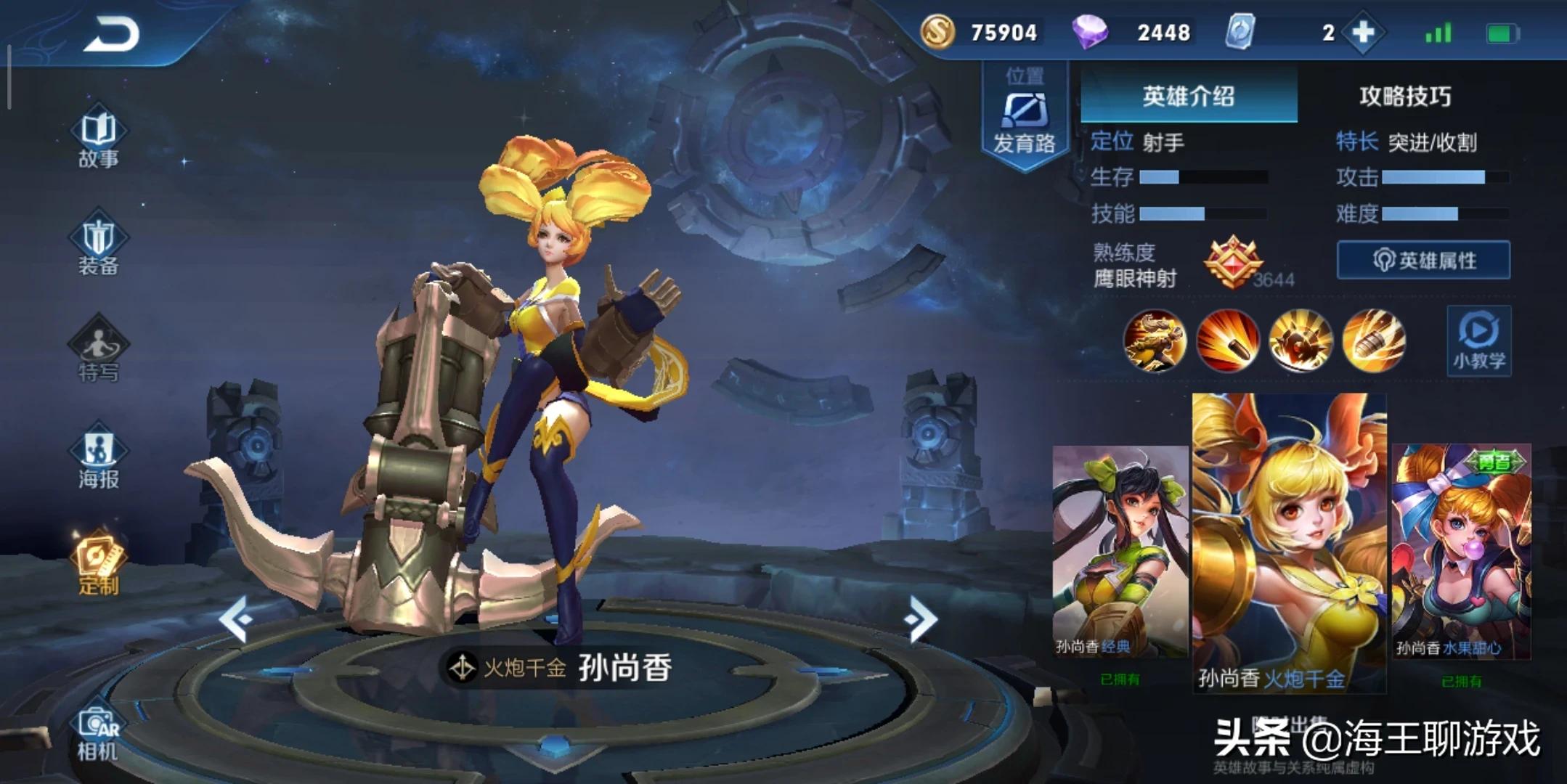 最后一款皮肤就是孙尚香的火炮千金,论起皮肤数量孙尚香是真的多,典藏皮肤传说皮肤勇者皮肤限定皮肤内测皮肤一大堆,这个火炮千金皮肤相信很多人都没有见过,这款皮肤海王是用过的虽然品质不高,但是语音还有手感都不输末日机甲,很不错的一款皮肤!
