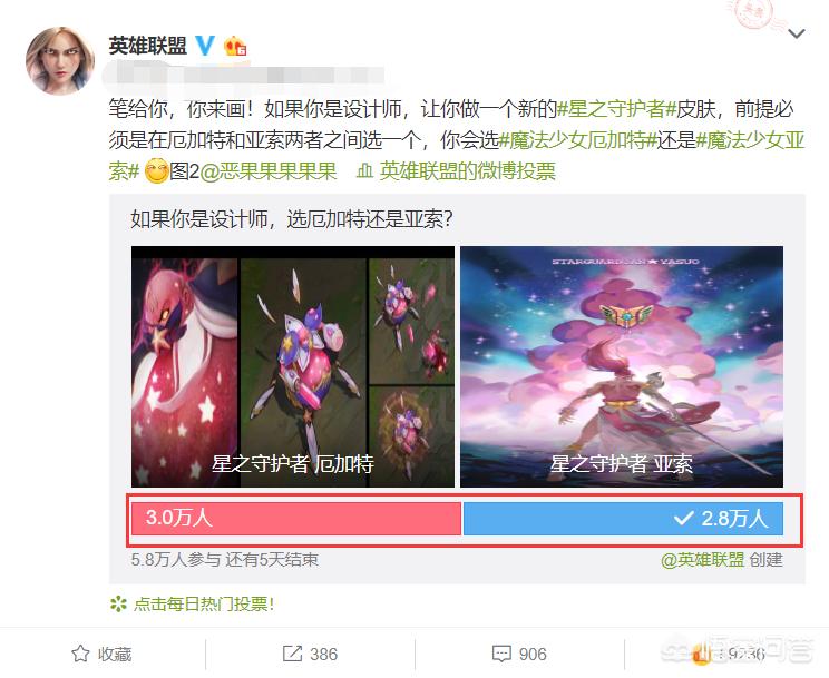 一直以来皮肤都是玩家们最关注的东西,而且拳头出皮肤也一直都是一个系列一个系列的出,而在这么多的系列当中有一个系列真的是被玩得不成样子了,这个系列就是星之守护者,也就是之前的魔法少女,当时这个系列的皮肤一出,所有人都想到了魔法少女厄加特,然而这次LOL的官方也是直接发起了一个投票,让网友们从厄加特和亚索中选择一个。