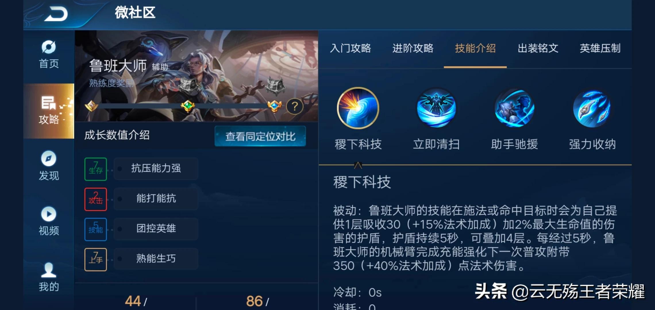 1.作为一个坦克型辅助,鲁班大师的一技能有很好的控制效果,即便是新手玩家不能熟练使用二三技能,仅仅是一技能也有不错的团战收益。